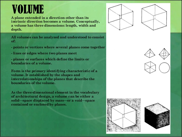 Volume is a three – dimensional form comprising length, width, and depth. Three – dimensional forms contain points (vertices), lines (edges), and planes (surfaces).